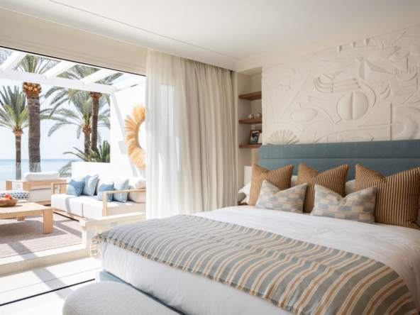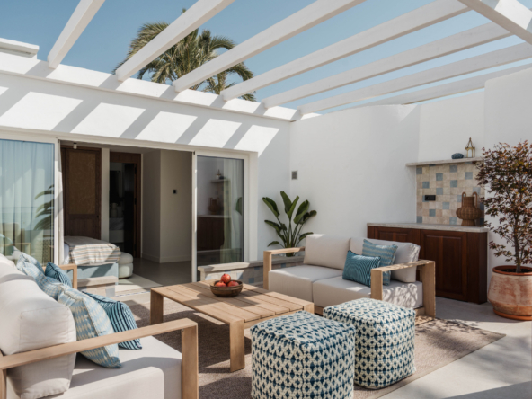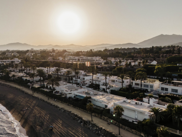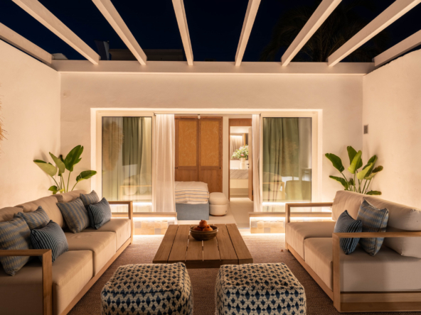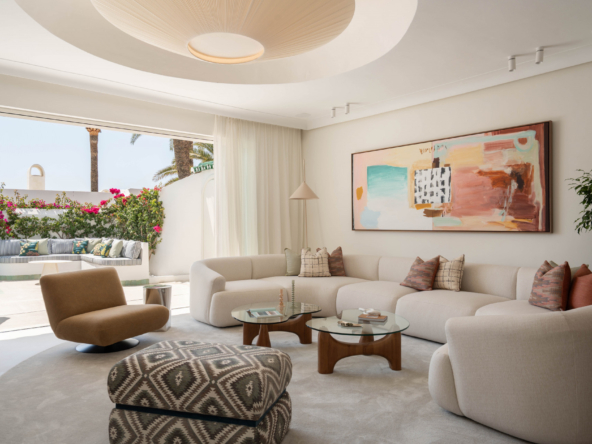 Discover this exceptional semi detached home in the exclusive Oasis Club, one of the most desirable beachfront communities on Marbella’s Golden Mile. Recently renovated with Marbella Club inspired design, the property blends timeless elegance with modern comfort. The entrance level is bright and open, connecting the living room, dining area, and social kitchen. Large sliding doors lead to a private garden created for outdoor living. Here you will find a heated pool, summer kitchen, and lounge and dining spaces, forming your own secluded retreat by the sea. A guest suite with en suite bathroom and a guest toilet complete this level. Upstairs are two additional bedroom suites, both with panoramic sea views. The principal suite offers a Mediterranean ambiance with its en suite bathroom and stylish walk in closet. The second suite opens to a spacious terrace with a lounge and wet bar, the perfect spot to enjoy Marbella’s sunsets. From the community, you have direct access to the beachfront promenade. Stroll to Puente Romano, Marbella Club, or even Puerto Banús, with fine dining, beach clubs, and world class amenities all within walking distance. This property combines prime location, refined design, and true beachfront living, a rare opportunity on the Golden Mile.