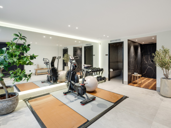 Outside, the villa offers a variety of terraces and landscaped gardens designed for relaxation and entertaining. A barbecue area, boules pitch, and innovative saltwater pool controlled by a smart KNX system complete the space. Additional features include private parking for several vehicles, a well designed laundry room, and ample storage. Natural materials such as wood, marble, and high quality ceramics run throughout the home, enhancing both style and durability.