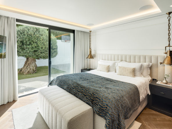 The entire top floor is dedicated to the master suite. This private retreat includes a walk in dressing area, an elegant bathroom, and access to two secluded terraces. From here, you can enjoy sea views and direct access to a private hot tub, making the space truly special.